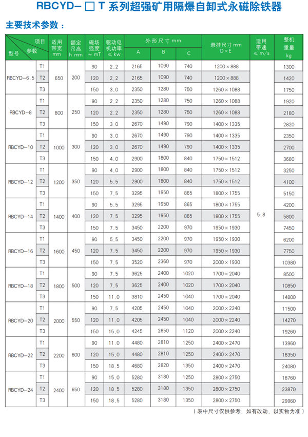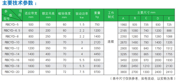 在甲烷爆炸性氣體的場(chǎng)所與帶式輸送機(jī)配合使用,適合帶速高、料層厚、環(huán)境惡劣的帶式輸送機(jī)上除鐵。